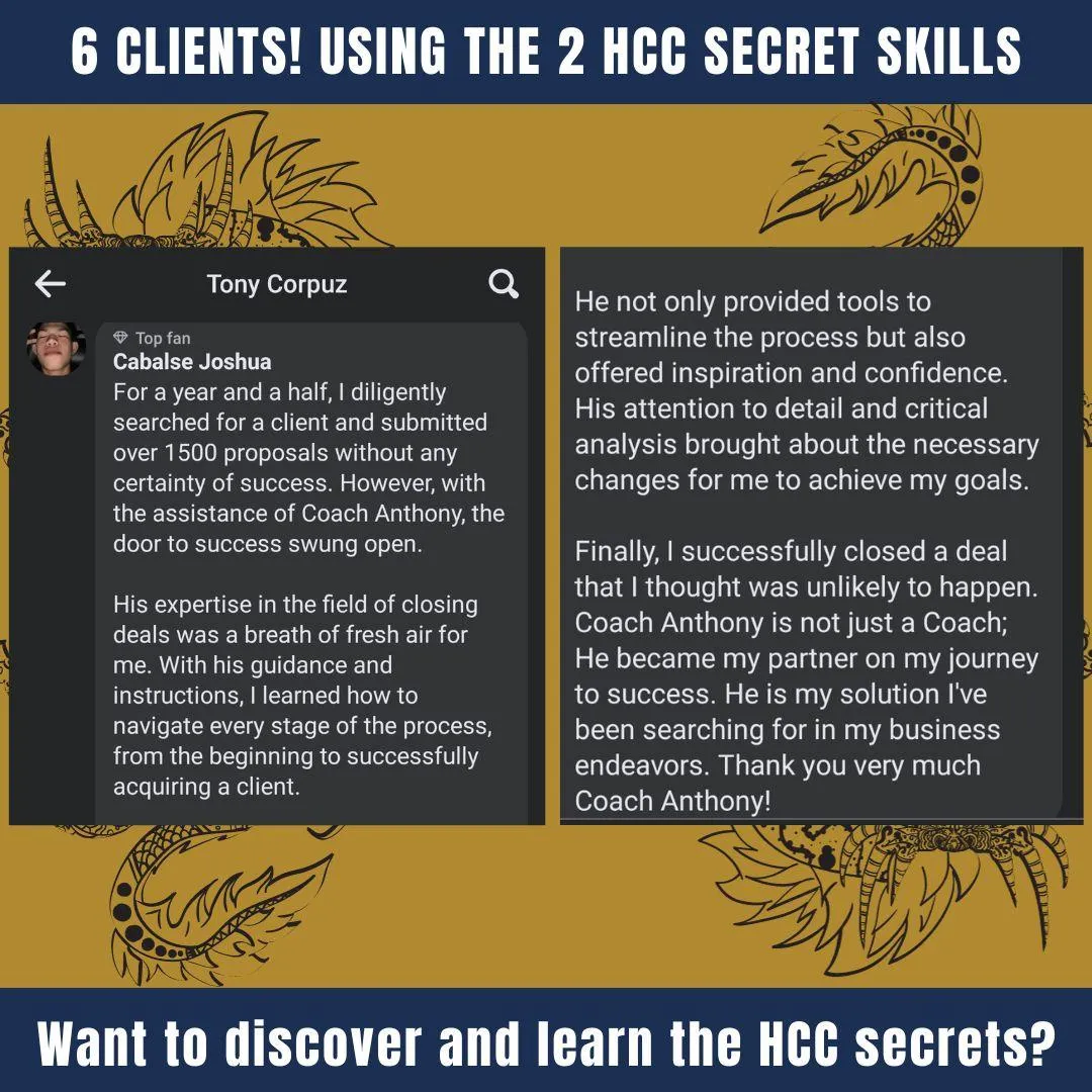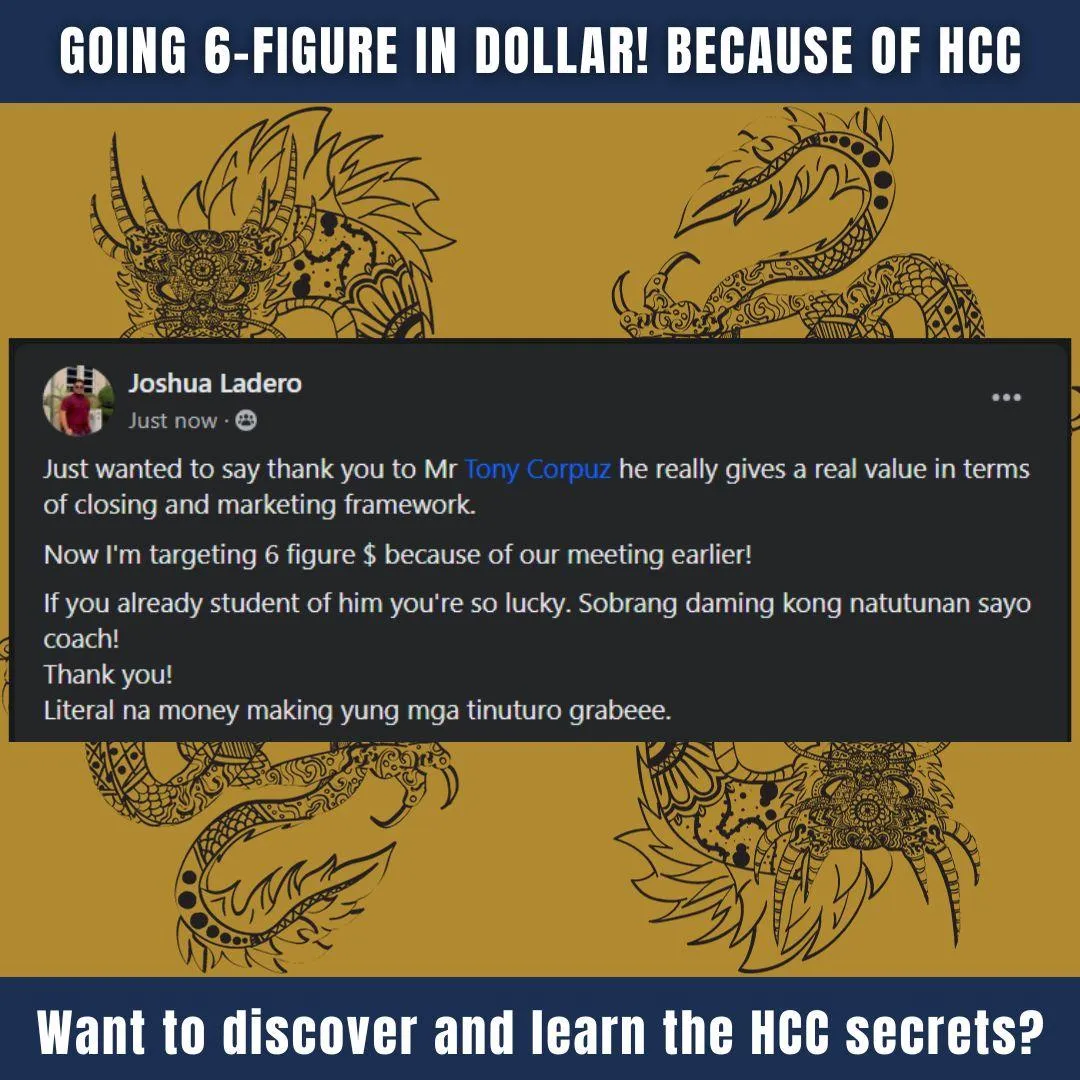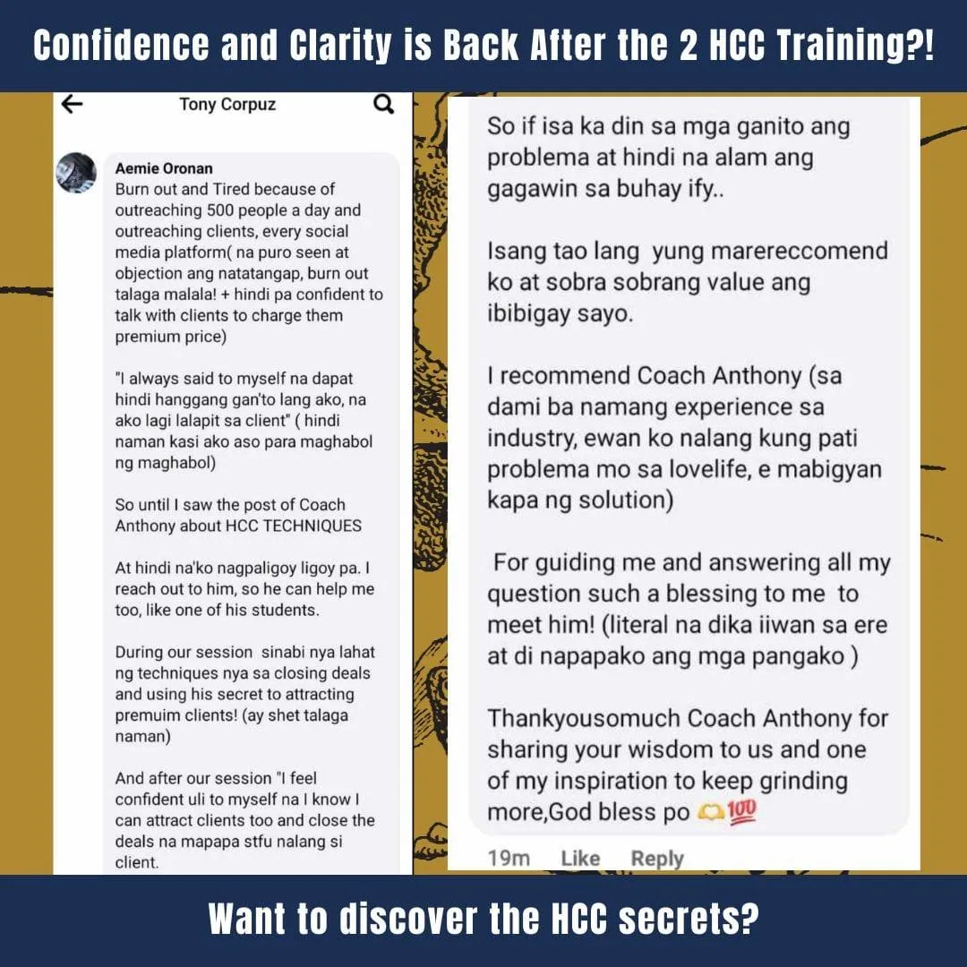 The truth is, I have an ulterior motive. You see, I want you to use what I show you in the 2HCC training series to get an immediate result in getting clients...I want you to effortlessly sign up more clients than you ever have before…I want you to feel more confident about your career and your future than you ever have before…Because… I know that when you start seeing better results immediately you'll get excited and return to invest in more "12-Month HCC Training" Programs with me.That's why I'm willing to give you ₱20,000 in attracting and closing client training and bonuses for just ₱5,000.