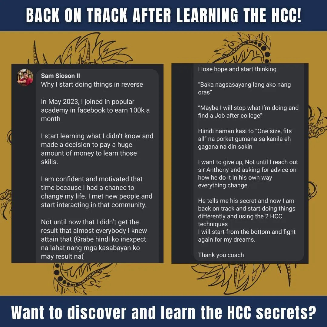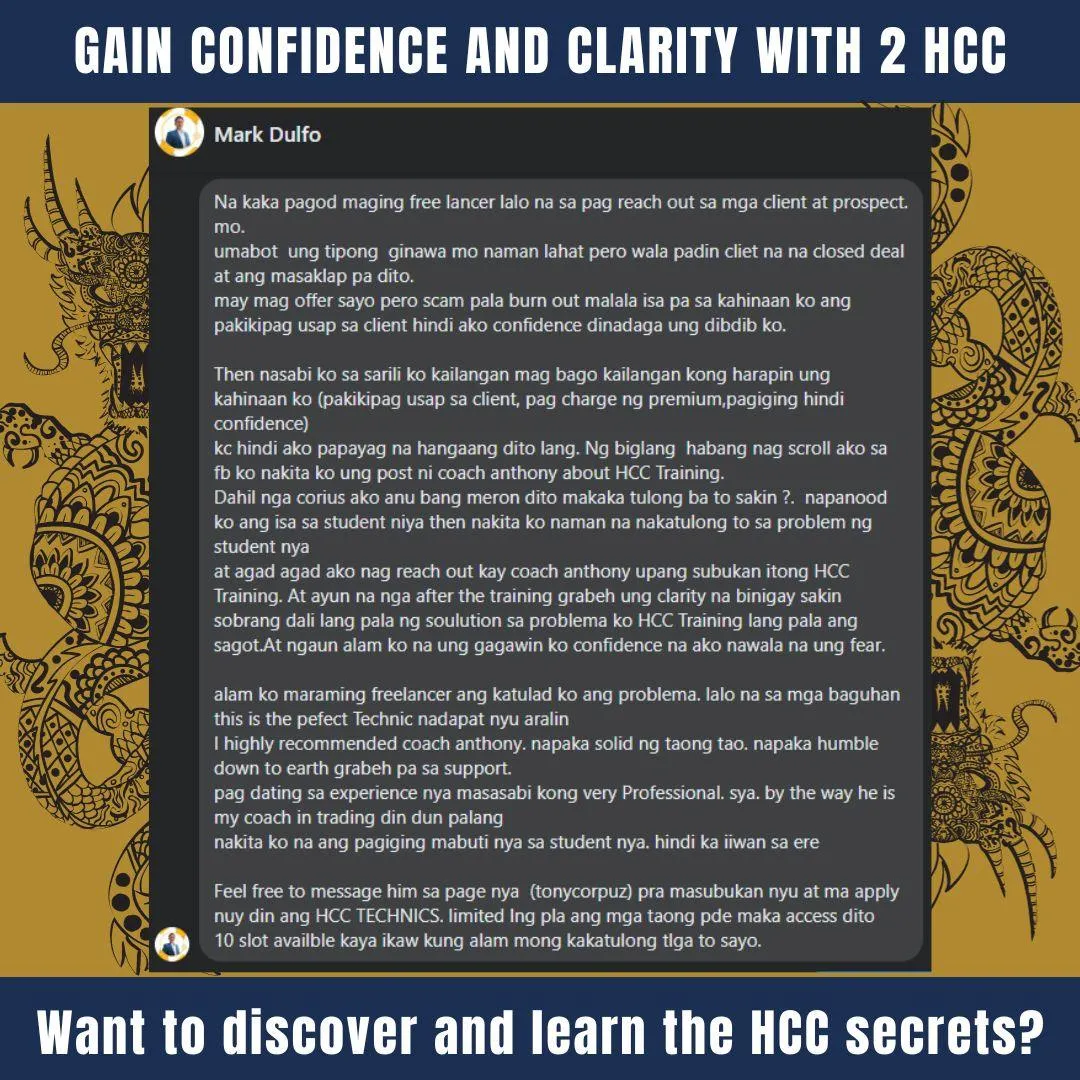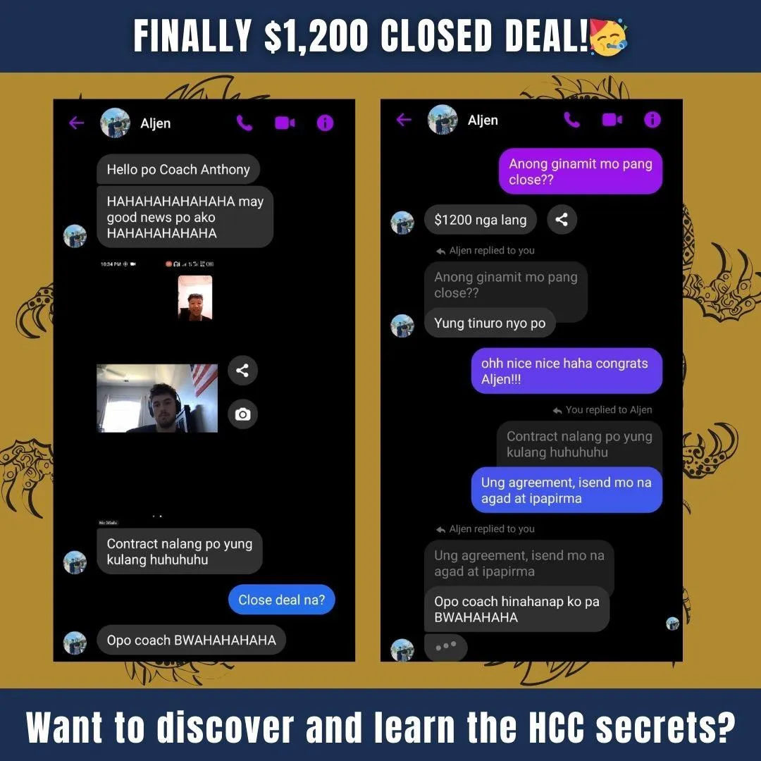 The truth is, I have an ulterior motive. You see, I want you to use what I show you in the 2HCC training series to get an immediate result in getting clients...I want you to effortlessly sign up more clients than you ever have before…I want you to feel more confident about your career and your future than you ever have before…Because… I know that when you start seeing better results immediately you'll get excited and return to invest in more "12-Month HCC Training" Programs with me.That's why I'm willing to give you ₱20,000 in attracting and closing client training and bonuses for just ₱5,000.